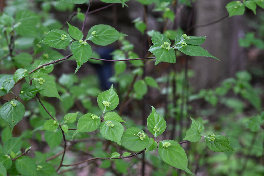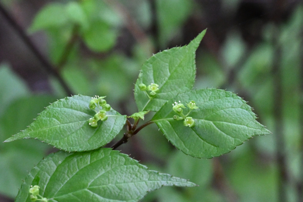 土佐の植物生態園(正門から入ってすぐ右側)に植栽があります。本州(中部・南部)・四国・九州に分布し、山地の林床に点々と生育します。ハナイカダの変種で、母種と比べて全体に葉が小さく広卵形になり、側脈は2~4対(ハナイカダは4~6対)です。ハナイカダの和名は、葉の葉脈に花がつく様子を筏に見立てたことから。牧野博士が1913年、「植物学雑誌」で、ハナイカダに比べて枝や小枝が細く、葉が小さいことから新変種として発表、和名コバノハナイカダの名をつけました。