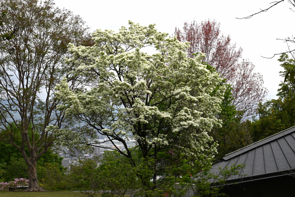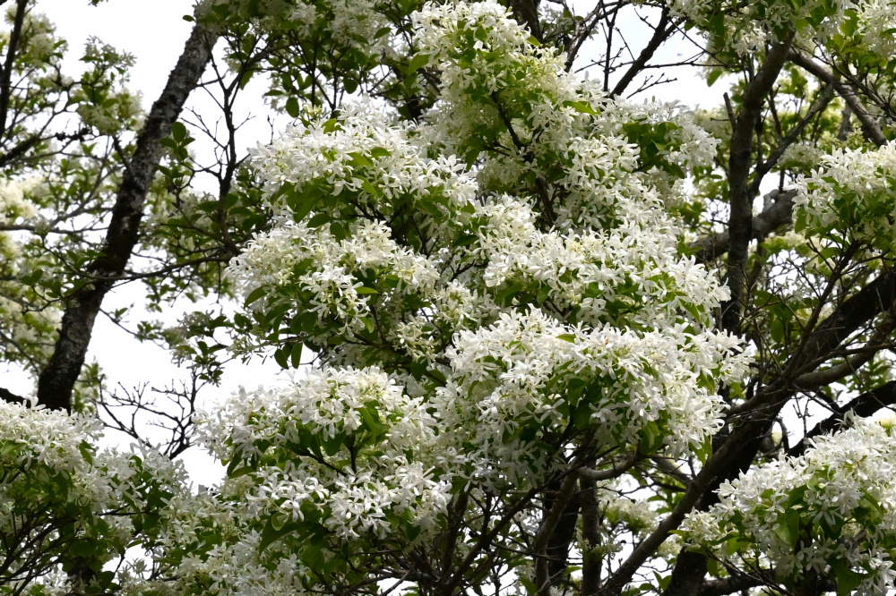本種は回廊や展示館周辺、南園など園内各所に植栽があり、4/17現在、回廊と展示館周辺(芝生広場側)で見ごろとなっています。日本国内では長野県・岐阜県・愛知県・対馬と飛び飛びに分布(隔離分布)する落葉高木です。白い花が満開になるとまるで雪が積もったかのようで見事です。和名は「一つ葉タゴ」の意で、タゴ=トネリコに似ていて葉が単葉であることから。ナンジャモンジャと呼称されることもあります。