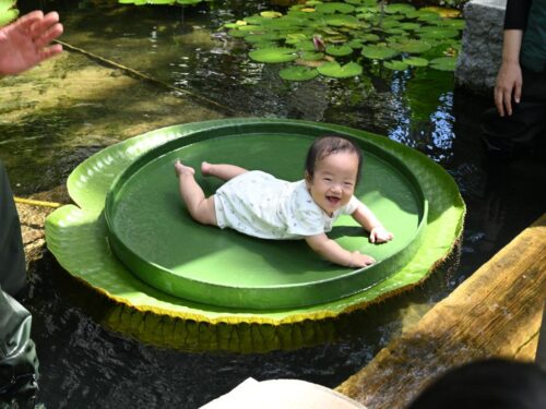 そんなオオオニバスの葉にお子さまを乗せて、大きな葉の浮力を体験できるイベントです。